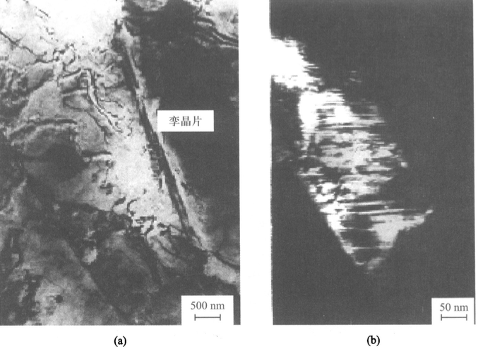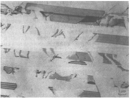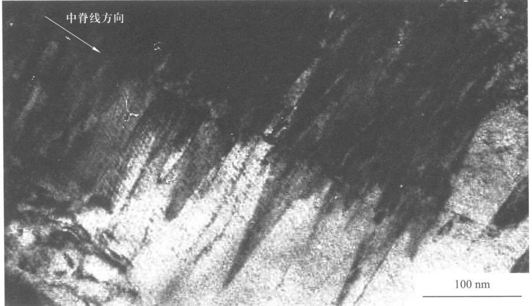 奥氏体的层错能较低,因此,奥氏体中还存在层错亚结构。层错是晶体缺陷,但层错能较低,可在一定条件下稳定存在。例如,将含氮奥氏体不锈钢样品加热到1100℃,保温30min,水冷进行固溶处理,在透射电镜下观察发现,含氮奥氏体晶粒中存在大量层错。