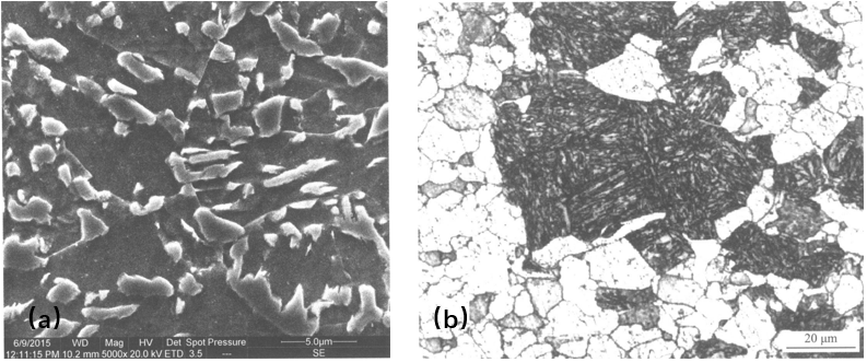 其灰黑色区域是先共析铁素体(在图中标注为F),白亮的颗粒是碳化物。在灰黑色基体上分布着呈短棒状或颗粒状的灰白色相,此区域是珠光体,也是一种类珠光体组织(在图34a中标注为P,a)所示的珠光体呈长柱状,碳化物尺寸较长b)为这些长柱状的碳化物的横截面形貌。