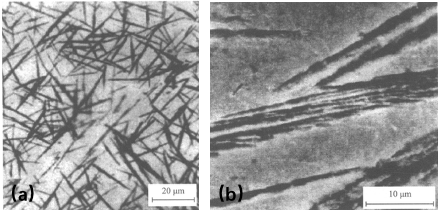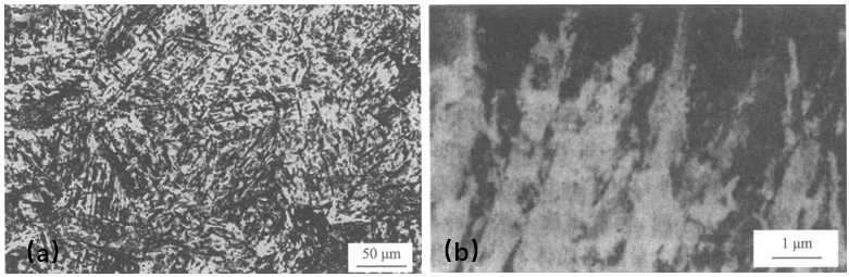 按贝氏体在中温区形成的位置分类 按贝氏体在中温区形成的位置,可将贝氏体分为上贝氏体和下贝氏体。在较高温度(Bs点到贝氏体的鼻温)形成上贝氏体,在贝氏体鼻温以下至Ms点附近的较低温度区域形成下贝氏体。 图1 (a)X80钢的上贝氏体组织;( b)9SiCr钢的下贝氏体组织(OM)