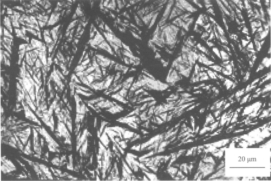 铸铁、超高碳钢、中高碳合金模具钢等其钢液凝固结晶时,可能形成莱氏体碳化物+奥氏体,其碳化物呈鱼骨状,这种莱氏体组织中的奥氏体在冷却过程中可转变为马氏体组织。图23所示为高铬铸铁的淬火组织。其中,白色鱼 骨状物为碳化物 ,这种碳化物是从液体铁水中结晶出来的一次碳化物,呈树 枝状长大, 在二维金相上呈鱼骨状。碳化物夹缝中是针状马氏体 +残留奥氏体 。其中,马氏体片为灰黑色 ,已经自回火,经氯化高铁盐酸水溶液浸 蚀后呈灰黑色,马氏体片夹缝中存在白色的残留奥氏体。而碳化物和奥氏体未受浸蚀。