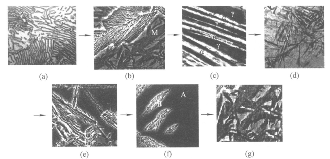 图2 组织形貌的过渡性图解(箭头指向即温度降低方向):(a)珠光体 (OM);(b) 羽毛状贝氏体;(c)无碳化物贝氏体 ;(d)下贝氏体(OM);(e)准下贝氏体 ;(f)下贝氏体;(g)马氏体(SEM)