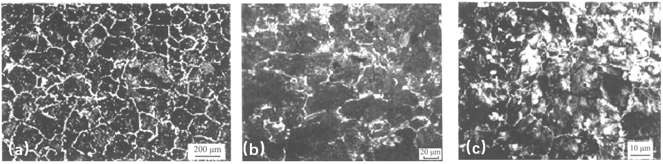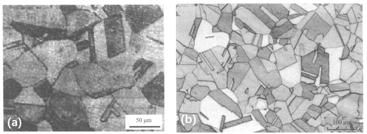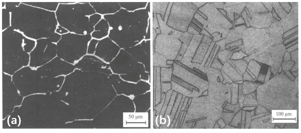 图6 a)50CrVA钢经 1100°C加热形成的奥氏体组织,是 C、Cr、V等元素溶入γ-Fe的固溶体;(b)奥氏体不锈钢1Cr18Ni9Ti在室温时的奥氏体组织,是, γ -Fe中溶入了C、Cr、Ni等化学元素形成的固溶体,可见,奥氏体晶粒中有许多孪晶。