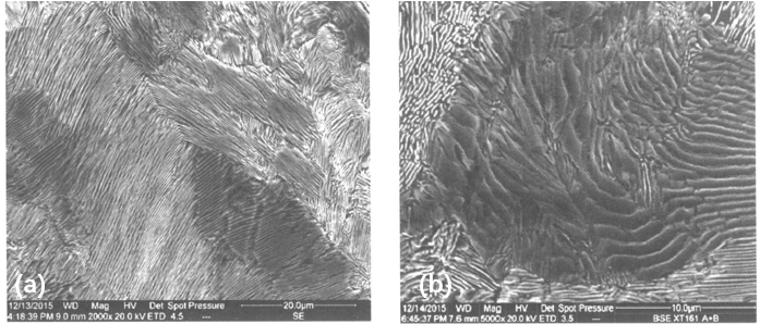 图3 (a)GCr15钢的羽毛状上贝氏体组织 ;(b)共析钢的片状珠光 体组织(SEM)