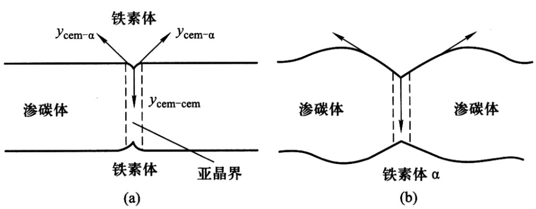图36 4Cr5MoV1Si钢的球化退火组织:(a)TEM;(b)SEM 图36所示为4Cr5MoV1Si(H13)钢于 870°C加热,保温,再于 750°C等温 ,缓冷后得到的粒状珠光体组织的电镜照片。(a)所示为透射电镜照片,黑色球状颗粒是未溶碳化物,基体是铁素体。图(b)所示为在扫描电镜下测定的碳化物颗粒尺寸 ,可见其在 30-80nm之间,分布较为均匀。同时 , 退火锻轧材料获得软化(180HB)。 获得粒状珠光体的途径还有两个 :一个是片状珠光体低温退火,使片状碳化 物逐渐球化 ; 另一个是马氏体或贝氏体组织高温回火 (低温退火 )。 如果原始组织为片状珠光体,将其加热到临界点A1,稍下的温度长时间保温,这时温度较高,原子具有扩散能力,片状珠光体具有较高的表面能,转变为粒状珠光体后系统能量(表面能)会降低,片状珠光体则自发地转变为粒状珠光体。片状珠光体由共析渗碳体片和铁素体片构成 。渗碳体片的亚晶界处具有凹陷的沟槽,如图37所示。 图37 渗碳体片的球化示意图