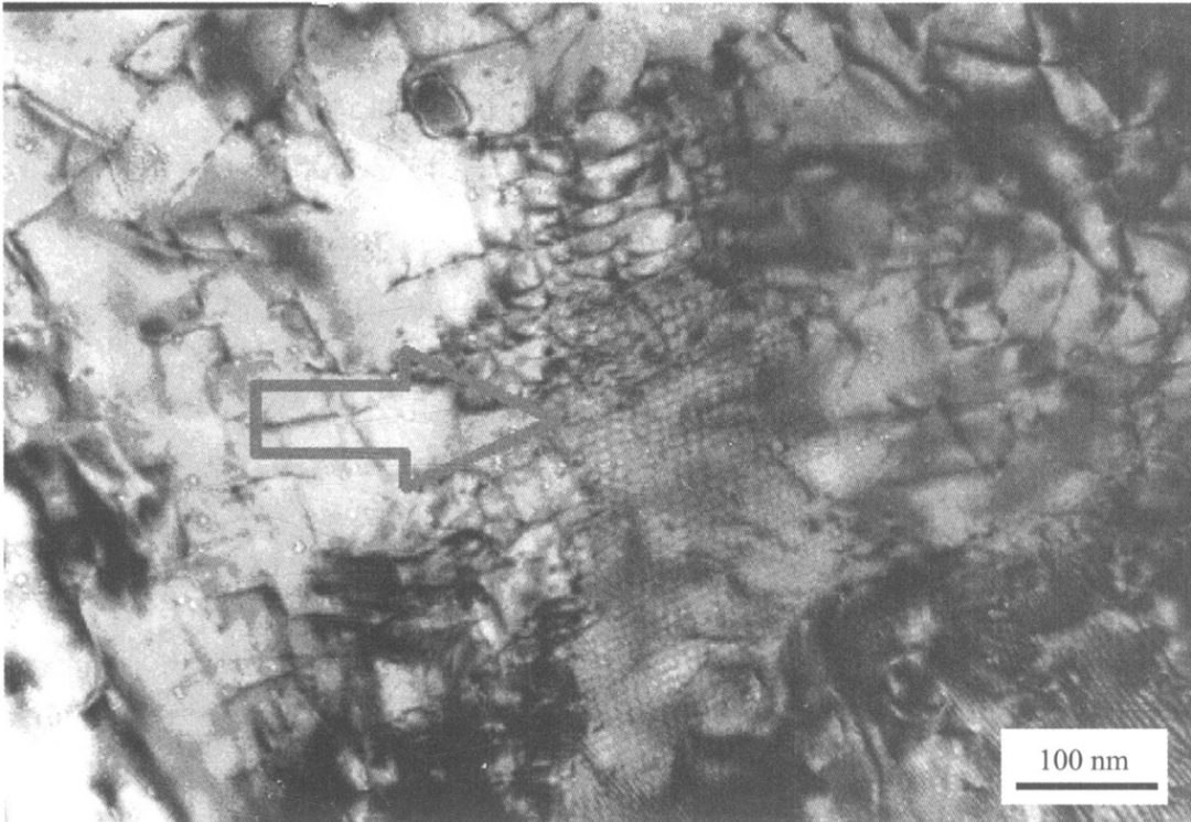 另外,珠光体(铁素体+渗碳体)逆共析形成奥氏体时,比体积变小,是体积收缩的相变过程,这必将产生应变和应变能。奥氏体晶粒在沿着<111>晶向的生长过程中,由于收缩造成的应变越来越大,为了调整应变能,系统自组织功能可改变长大方向,沿着另一个<111>晶向生长,因此形成了孪晶。孪晶的特征是具有平直的界面,即孪晶界,相对于某一晶面的原子排列是镜面对称的。高分辨透射电镜(high-resolution transmission electronmicroscopy, HRTEM)下可清晰地观察到镜面对称的形态。