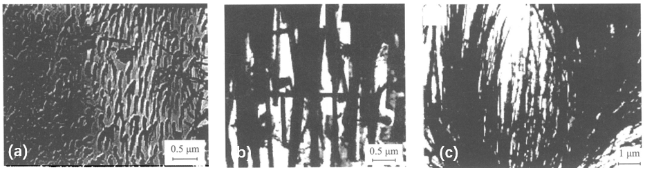 图22 H13钢的珠光体组织(TEM):(a)短棒状;(b)树林状 ;(c)丛针状
