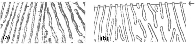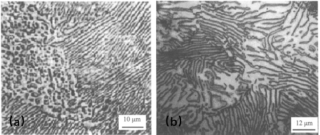 图1 两种合金的片状组织的比较 :(a)Cu-11.8%Al合金的共析组织(OM);(b)T8钢的片状珠光体组织(OM)
