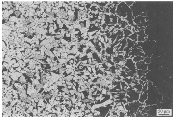 H13钢是中碳中合金钢,其钢锭中容易出现液析碳化物,锻造时可被碎化 ,并且沿着压延方向分布。钢中的枝晶偏析,会形成带状组织,也沿着锻轧方向分布。图24所示为H13钢的带状组织及液析碳化物。带状组织和液析碳化物均降低钢的韧性,也容易在模具淬火时导致裂纹产生,必须消除。清除带状组织和液析碳化物的最好的方法是将钢锭或锻坯进行均质化退火,即加热到 1250-1300℃保温 30h。