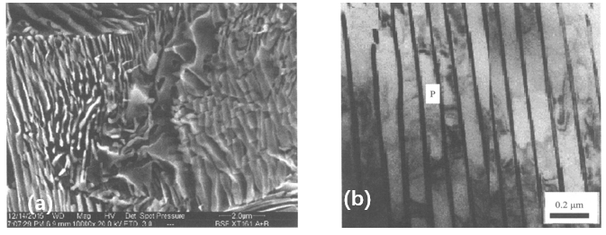 图17 (a)高碳钢的片状珠光体组织(SEM);(b)Fe-2.6%Cr-0.96%C合金的珠光体组织(TEM)