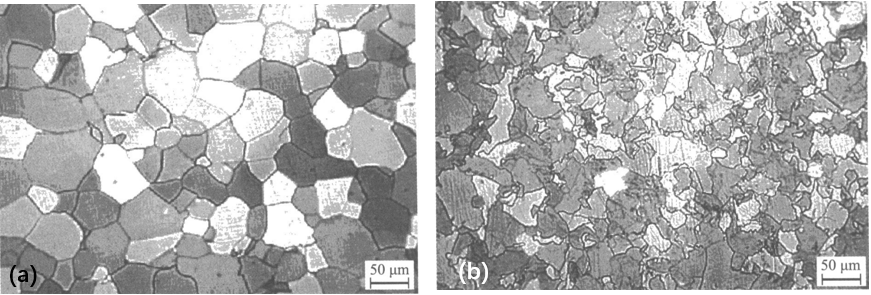 图11 (a)铁素体的多面体晶粒;(b)纯铁的铁素体等轴状晶粒(OM)
