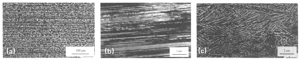 图3 钢中的各种条带状组织(a)OM:1 6Mn2VNb经热轧空冷后的“流线”形貌,实际上是带状组织,白色区域是贫碳带,黑色区域是富碳、富含合金元素的区域,珠光体组织较多,是由枝晶偏析造成的;(b)TEM:Fe-Mn-Si-Al合金的孪晶组织,是在挤压成形过程中形成的形变孪晶;(c)SEM:为超低碳贝氏体钢经热轧-控制冷却得到的极细小的条片状贝氏体组织。