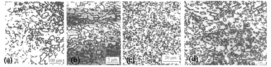 图19 高碳钢的颗粒状渗碳体形貌(OM):(a)T10钢的退火组织 ;(b)Fe-1.4%C 合金的退火组织;(c)Cr2钢的退火组织;(d)GCr15钢的球化组织