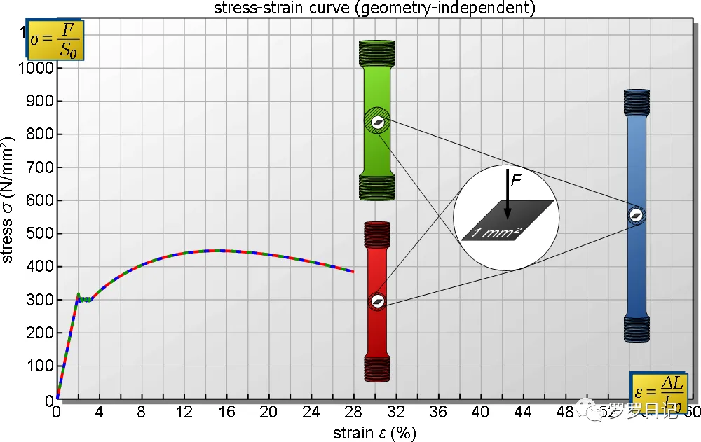 但是换算到应力和应变的关系后(图2),曲线就变得和几何尺寸没有关系了。