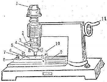 1——荷重盘;2——升降盘;3——卡针盘;4——回转半径调整螺栓;5——固定样板调整螺栓;6——试验台;7——半截螺帽;8——固定样板调整螺栓;9——试验台丝杠;10——调整螺栓;11——摇柄