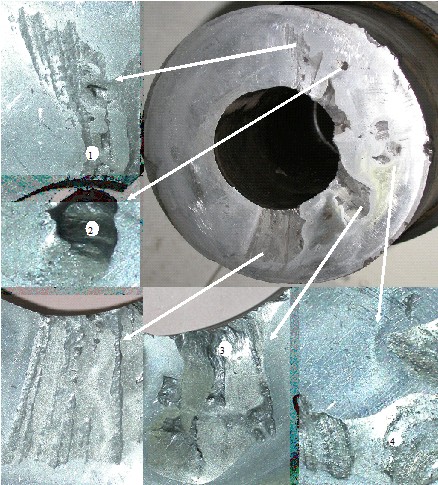 调查分析结果表明:金相和化学分析结果表明,失效钎头断口附近的组织为正常的调质组织,夹杂物尺寸和形态均正常,断口附近的化学成分正常。对失效钎头材料的力学性能测表明,该材料的屈强比较高,材料的延伸率很低,塑性降低明显,表明材料在服役过程中发生了氢脆。残余应力试验表明失效钎头的周向不存在明显残余应力。对失效断口的分析和失效材质的疲劳试验表明,钎头失效的原因之一是冲击疲劳断裂,扭转产生的剪切应力起主要作用;粗糙表面或内部较大的夹杂物促进了裂纹发生,对最终断裂失效取到促进作用。钎头开裂事故的主要原因是典型的高强钢湿硫化氢应力腐蚀开裂,属于氢脆型,并伴有腐蚀疲劳的发生。建议更换在此环境下服役的钎头的材质,在保证强度、硬度等指标的前提下,采用较低屈强比、耐疲劳和耐腐蚀的材料。提高钎头表面加工精度,尤其是内径表面的精度。在钎头使用前,进行缺陷和夹杂无损检测。