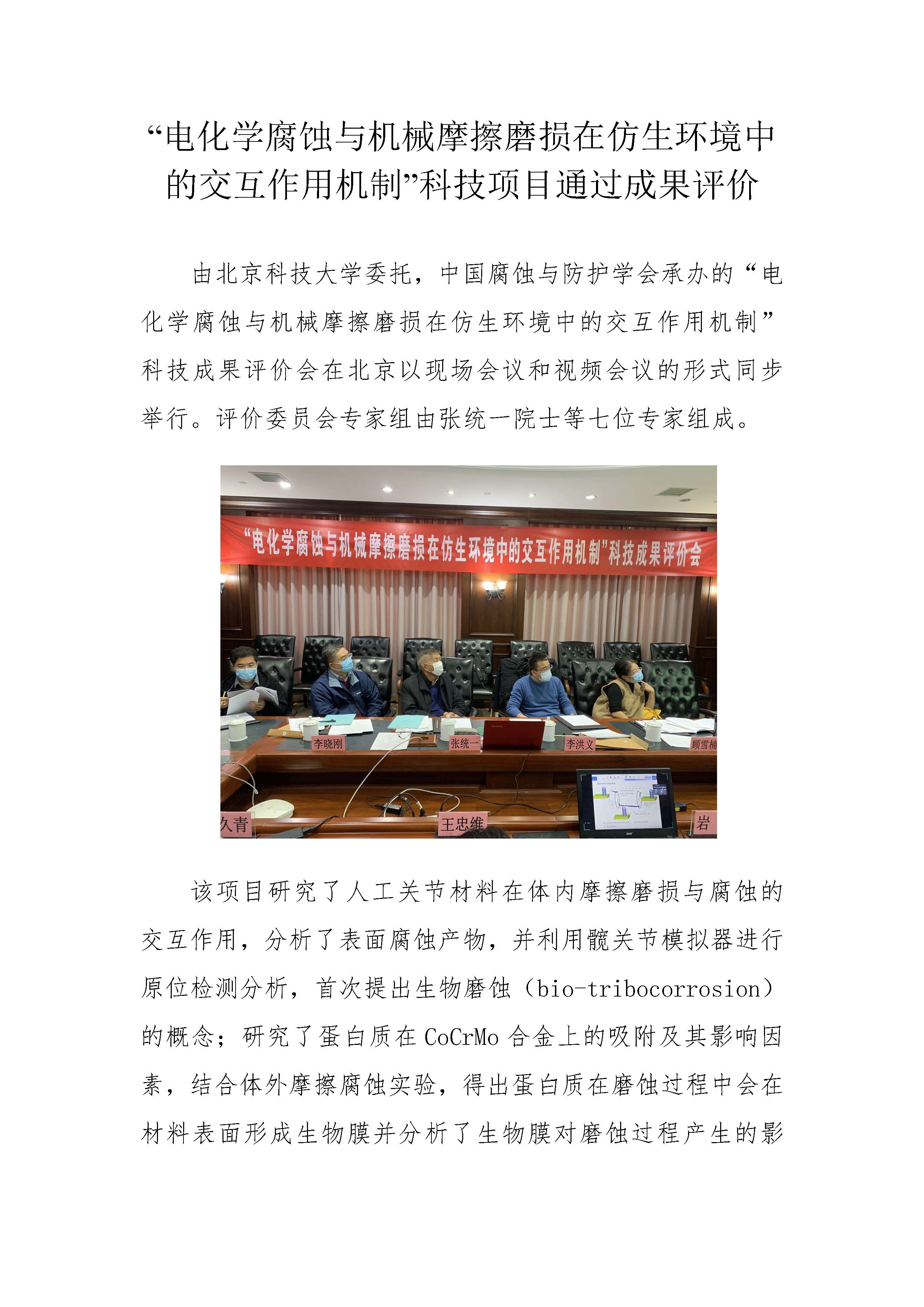 “电化学腐蚀与机械摩擦磨损在仿生环境中的交互作用机制”科技项目通过成果评价