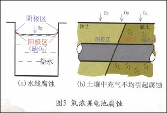 氧浓差电池并不能解释局部腐蚀现象。在实际生产中,氧浓差电池的确会加重腐蚀,例如:水线腐蚀,土壤中因充气不均而引起腐蚀的加剧等,如图5所示。