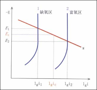 当这两个不同电位的表面构成氧浓差电池时,它们彼此极化至相同的电位Ec,两部分的阳极溶解电流密度也都等于ic。此时,与富氧溶液接触的金属表面部分(阴极区)的腐蚀降低了,从原先的i2降至ic,与缺氧的接触部分(阳极区)腐蚀确实是被加速了,从原先的i1增大至ic。
