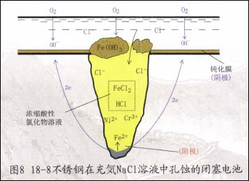 (3)氯化物发生强烈水解,使孔内介质酸度增大,例如,Cr18Nil2Mo2Ti不锈钢孔内C1-浓度可高达6M,pH接近于零。