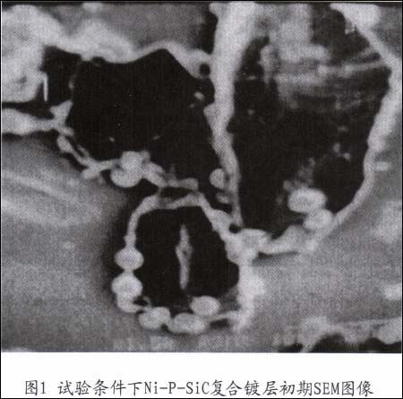 如图可见,SiC微粒己经镀附在试片表面,SiC微粒表面和四周锐边己有微球胞状镀层,试片表面(原高磷化镍抛光面)上有擦伤,划痕纵深为Ⅴ型,似硬质SiC的锐边与基体表面接触摩擦形成的“犁沟状”刻划伤。对照试验,在同样的条件下,未浸入己镀硬盘试片,SiC微粒的表面没有任何镀层,说明SiC表面无催化活性。微粒与基体的接触和摩擦是实现复合镀的必要条件。