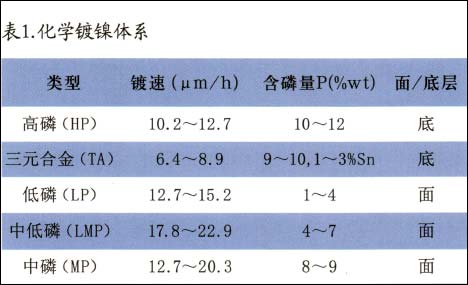 在“符合ROHS指令的双层化学镀镍”一文中,作者介绍其商品化学镀镍基本类型,建议采用双层或多层镀镍的方式以满足用户对于防腐蚀性能、耐磨损性能或装饰性能等不同的技术要求。化学镀镍商品基本类型如表1所示。
