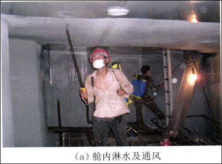 无机硅酸锌涂料的完工报检是指第一度喷涂及修补、修喷后,整舱(包括舱底)的漆膜检查,此时的漆膜表面应无明显的缺陷,无漆雾、针孔、龟裂及流挂等,膜厚达到规定要求,完工合格后需整舱喷淋淡水图2三度漆预涂及清洁(图3a),通自然风,以促使无机锌的固化,要保证漆膜表面的湿润但不能积水,保证舱内的通风。常温状态下,良好的保湿及通风,12~24h后,无机锌就能固化,舱室干燥4h后就可着手做MEK测试或硬币刮擦测试(图3b)。MEK测试合格后方能拆除脚手架,如果测试不合格,说明油漆还未固化,仍需给水以帮助固化直至MEK测试合格,拆架前擦去所有记号笔痕迹并用记号笔在舱底明显框出所有管脚位或待处理区域。