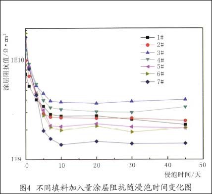 从图4可以看出,浸泡10天之后,涂层阻抗值基本保持稳定,而且随着填料含量的增加,涂层的阻抗值先增大后减小,防腐填料的添加量为40%左右时,涂层的阻抗值最大,阻抗值稳定在3.8×109Ω·cm2左右,所以确定防腐填料的最佳添加量为40%。