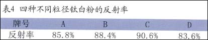 试验中选择粒径均在1um内的4种不同产家的钛白粉A、B、C、D,配置相同颜料体积浓度下的反射隔热涂料,各样板的热反射率,结果见表4所示。