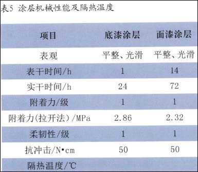 制备了底漆和面漆二层结构反射隔热防腐涂层,其中底漆厚度为100μm,面漆厚度为2mm,其机械性能及隔热温度见表5。