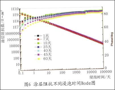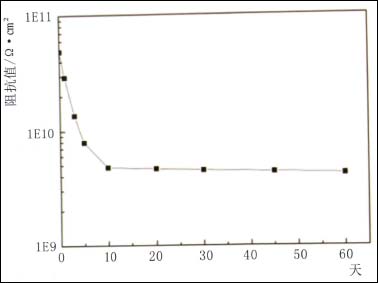 从图6可以看出,涂层阻抗值对频率做的对数图为一条斜线,相位角的变化范围很小,这说明底漆涂层是一个电阻值很大的隔绝层,涂层阻抗随浸泡时间变化趋势如图7所示。研究结果表明,随着浸泡时间的增长,涂层阻抗值逐渐减小,7天后阻抗值基本稳定,浸泡60天涂层阻抗值仍达到6×109Ω·cm2,说明漆膜致密,具有很好的抗渗防腐性能。
