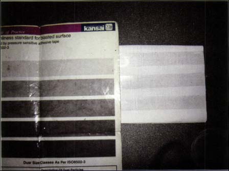 检查方法按ISO 8502-3,采用压敏胶带法检查,胶带与ISO 8502-3的参考样板比较,灰尘等级不能高于3。试样灰尘等级检测如图1所示。