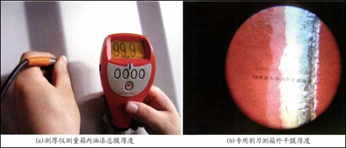 (a)测厚仪测量箱内油漆总膜厚度(b)专用割刀测箱外干膜厚度