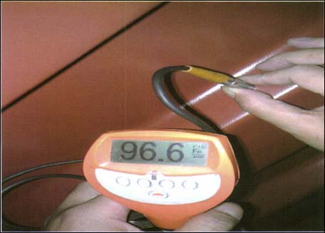 目前新造干货集装箱实行基本涂料配套保用5年,对总干膜厚度的最低要求是:箱外110~120μm,箱内70~80μm,底架沥青漆钢构部分200μm、木地板部分150um。对某集装箱箱外检测结果如图4所示。