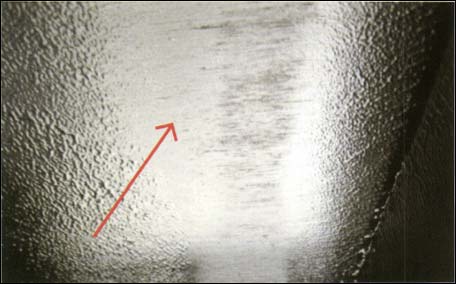 油漆外观常见缺陷有:流挂、桔皮、起皱、露底、真孔、鱼眼、泛白、粉化、开裂等,对影响油漆外观和性能的上述较明显缺陷,应找出产生的原因并进行修补。箱底黑色沥青油漆的露底现象如图5所示。