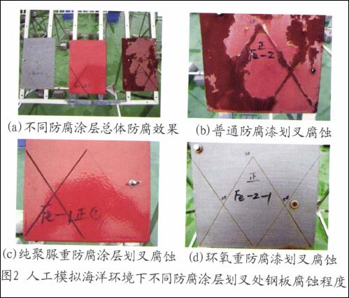 经过人工模拟海洋环境的腐蚀后,普通防腐漆最先在划叉裂纹处开始起泡并剥落,之后迅速扩展至整块钢板,涂层大量剥落;环氧重防腐漆仅在划叉处有轻微的鼓起,但并不脱落,防护效果较好;纯聚脲涂层在2~3mm的凹槽处,则没有任何起泡、脱落和腐蚀区域扩展等不良现象,涂层外观坚实,与钢板结合紧密,附着力很好。说明纯聚脲材料的高强度、高弹性、优异的耐老化性能,发挥了至关重要的综合防护作用。