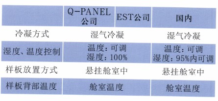 经调研,国际上专业生产环境试验设备的公司:美国Q-PANEL公司和EST欧洲环境模拟技术有限公司有生产同类产品。美国Q-PANEL公司、EST欧洲环境模拟技术有限公司定型产品采用湿气冷凝方式,其产品符合(ISO 6270.2— 2005标准的要求),可实现舱室底部有40℃ 的淡水,上部空气湿度100%要求,试验样板垂直悬挂在舱室中。这两家公司与国内现有的冷凝试验技术对比如表1所示。