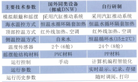 模拟压载舱试验舱采用气缸推拉伺服摇摆系统达到的海水泼溅效果与国外同类试验装置相当;在试验程序计算机编程自动化控制、试验温度参数控制精度和实时监控、显示、存储、历史数据查阅等方面具有显著创新性,总体性能处于国际同类先进水平,对比结果如表2所示。