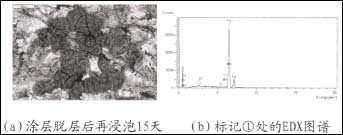 图5(a)为涂层浸泡4天后脱层的SEM照片,从照片中可以明显看出,钢材基体表面己有明显腐蚀产物形成,说明基体己经开始发生腐蚀反应。