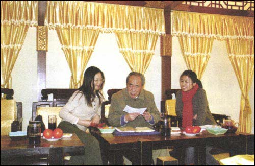 肖纪美院士(中)与本刊负责人雷有艮女士(左一)等对有关科普宣传的问题展开讨论。专注的神情,体现着肖老一贯的一丝不苟的治学风格。