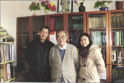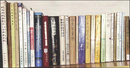 肖纪美院士(中)和本刊记者合影,身后的书架上分门别类摆放整齐的书籍,说明着主人那渊博的学识来源于无休无尽的学习、学习、再学习中。