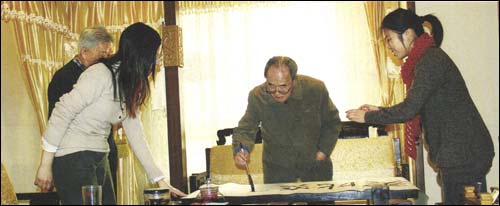 来到肖先生的家里,我们被屋里大大小小十几个书架所震撼,书架里摆满了各式各样的书,就像是-个微型的图书馆。肖先生介绍说,自己有很多的读书笔记,读书、做学问就是他的生活。家中除了这些书架再没有什么富丽堂皇的装潢,整个房间透着一种简洁、清新的感觉。屋内的陈设也非常简单,由此可见肖先生日常的生活是多么简朴。