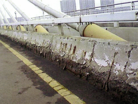在我国北方冬季是多雪、冻融交变发生概率最大的区域,无论是北方内陆江河区域,还是沿海区域,甚至市政交通网络中的过街天桥也时常经受冻融危害。混凝土结构中存在大量的孔隙和裂缝,水分可通过毛细作用进入具中,当温度降到冰点时,水会结冰膨胀,使孔壁受压变形,环境温度升高,冰融化成水,体积缩小,使孔壁受到拉应力。反复的冻融过程会使混凝土结构浅表面出现裂纹,并逐渐酥松、脱落,逐步侵蚀整个结构.冻融不仅破坏混凝土本身,也会使其中的钢筋失去保护,从而造成钢筋腐蚀.因此,冻融破坏是我国北方桥梁混凝土结构破坏的主要因素之一。(见图2)