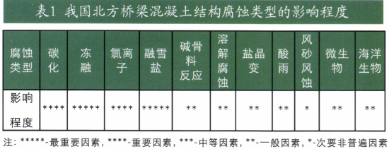 我国北方地区桥梁建设所处区域具有很大的地域差异性,所面临的腐蚀环境不仅包括大气腐蚀、水介质腐蚀和土壤腐蚀三种主要的腐蚀环境,还有风蚀、冻融、微生物腐蚀、海生物腐蚀、化工介质腐蚀等等.不同区域的腐蚀特征,特别是重点需要防护的腐蚀因素也存在差异.我国北方桥梁混凝土结构的腐蚀重要因素见表1.