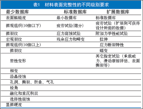 1964 年美国学者Field 和其同事Kahles 通过对高强度钢的机械加工表面的系统研究,首次提出了“表面完整性”的概念,并定义为“表面完整性是通过机械加工或其它生成表面方法赋予材料表面所固有或加强的状态”(Surface integrity is defined as the inherent or enhanced condition of a surface produced in machining or other surface generation operation)。该概念的提出,使人们加强了对材料表面重要性的认识,但由于人们很难理解此概念的定义和在工程中难以执行,1971 年他们给出了材料表面完整性的不同级别要求(最少数据库、标准数据库和扩展数据库),见表1。