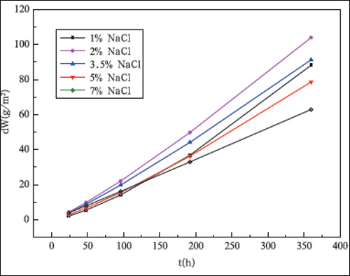 浓度对腐蚀速率的影响表现为从在1% 浓度NaCl 中的腐蚀速度升高,在2% 与3.5% 浓度NaCl 中腐蚀速率达达到最高,而随后5% 与7% 浓度的NaCl 中的腐蚀速率降低,可能是由于高浓度的NaCl 溶液并不有利于腐蚀的产生,2% 浓度时腐蚀速率最大, 锈层保护效果最差。