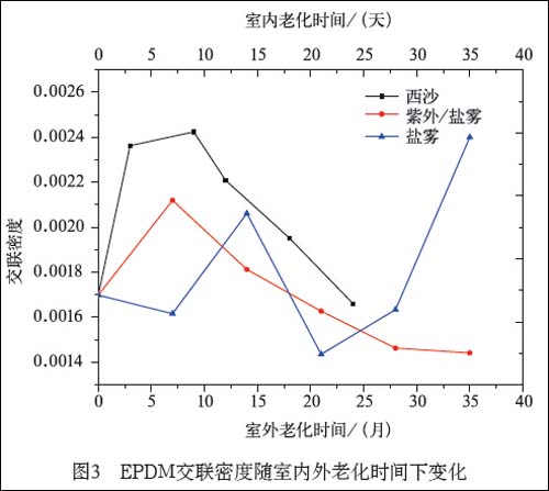(2) 交联密度和红外光谱分析表明,西沙大气暴晒试验和紫外/ 盐雾循环试验条件下,EPDM 橡胶老化初期以交联为主,后期以降解为主,老化产物有β- 二酮的生成。而盐雾实验条件下, 交联密度呈波动变化,没有β- 二酮的生成。表明从老化机制上, 紫外盐雾试验与西沙大气暴晒试验相关性较好,单一盐雾试验不能模拟西沙大气暴晒试验。