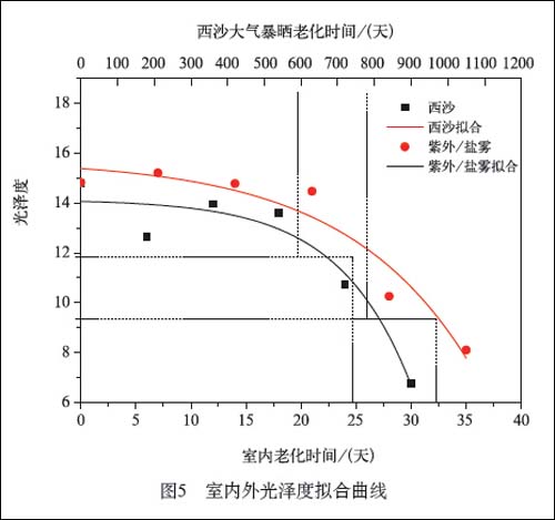 对光泽度- 老化时间变化进行拟合(如图5),得到室内外环境下光泽度- 老化时间的变化指数方程,光泽度随老化时间呈指数下降。