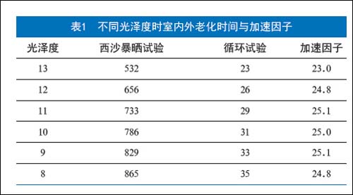 基于一定的光泽度值,取出室内外对应的老化时间,两者进行对比得出加速因子如表1。