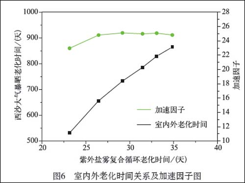 根据表1 作出西沙大气暴晒与紫外/ 盐雾循环试验的加速因子图,如图6 所示。
