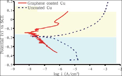 图3 有石墨烯覆盖的铜和无石墨烯覆盖的铜的动电位极化曲线